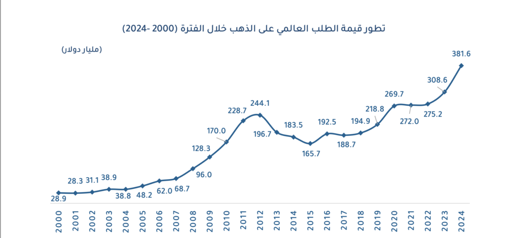 • ٣٨١٫٦ مليار دولار- هي قيمة الطلب العالمي على الذهب خلال عام ٢٠٢٤، مقارنة بنحو ٢٨٫٩ مليار دولار عام ٢٠٠٠، وفقا لإحصاءات مجلس الذهب العالمي.