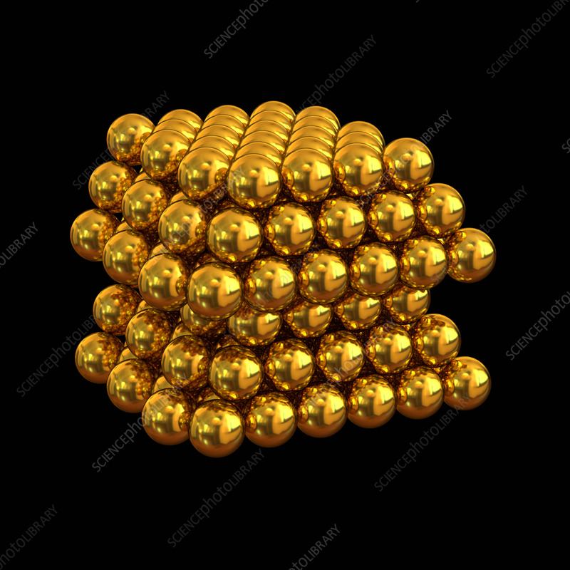Illustration of gold (Au) atoms in a metallic crystal structure. The atoms are arranged in a face-centred cubic (FCC) unit cell structure. In this arrangement, there are atoms at each corner of the cube and an atom centred on each face of the cube. This creates a highly symmetrical structure with a dense packing of gold atoms.