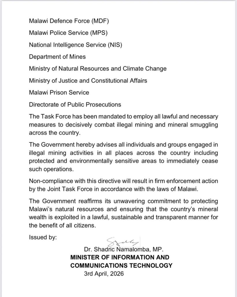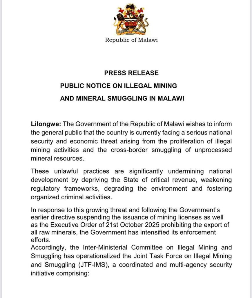 وجاء الإعلان في بيان رسمي وقّعه وزير الإعلام وتكنولوجيا الاتصالات في مالاوي، شادريك نامالومبا مبا (Shadric Namalomba ) أكد فيه أن التعدين غير القانوني وتهريب المعادن الخام عبر الحدود يمثلان تهديدًا خطيرًا للدولة، ليس فقط بسبب خسارة الإيرادات، ولكن أيضًا بسبب الأضرار البيئية وانتشار الجريمة المنظمة المرتبطة بتهريب الموارد الطبيعية.